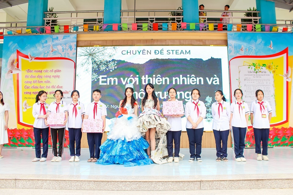 hỏi để mang đến cho HS những tiết học hấp dẫn, thú vị và bổ ích, ngày 7/4/2023 vừa qua, trường THCS Vĩnh Niệm đã tổ chức thành công chuyên đề cấp trường dạy học STEAM chủ đề “Em với thiên nhiên môi trường”. Tiết dạy của cô giáo Nguyễn Thị Hồng Hạnh và cô giáo Đoàn Thị Duyên cùng sự tham gia của các em học sinh khối 6,7 tìm hiểu về thiên nhiên, môi trường và với những kiến thức đã học để đưa ra giải pháp bảo vệ thiên nhiên môi trường. Các em đã vận dụng các kiến thức liên môn KHTN, Toán học, HĐTN&HN, mỹ thuật, âm nhạc,… hài hòa để thể hiện trong tiết học thông qua 3 phần thi: Khởi động, Tăng tốc và Về đích.